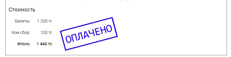Электронды билеттерге төлем жүргізгеннен кейін сіздің тапсырысыңыздың мәртебесі ТӨЛЕНГЕН күйіне ауысқанына көз жеткізіңіз. Ол үшін Билеттер – Тапсырыс күйі сайты арқылы мәзірге кіріңіз, өз тапсырыс нөміріңізді енгізіп, өз интернет-броныңыздың түбіртегін алыңыз. Түбіртекте ТӨЛЕНГЕН белгісі болуы тиіс.